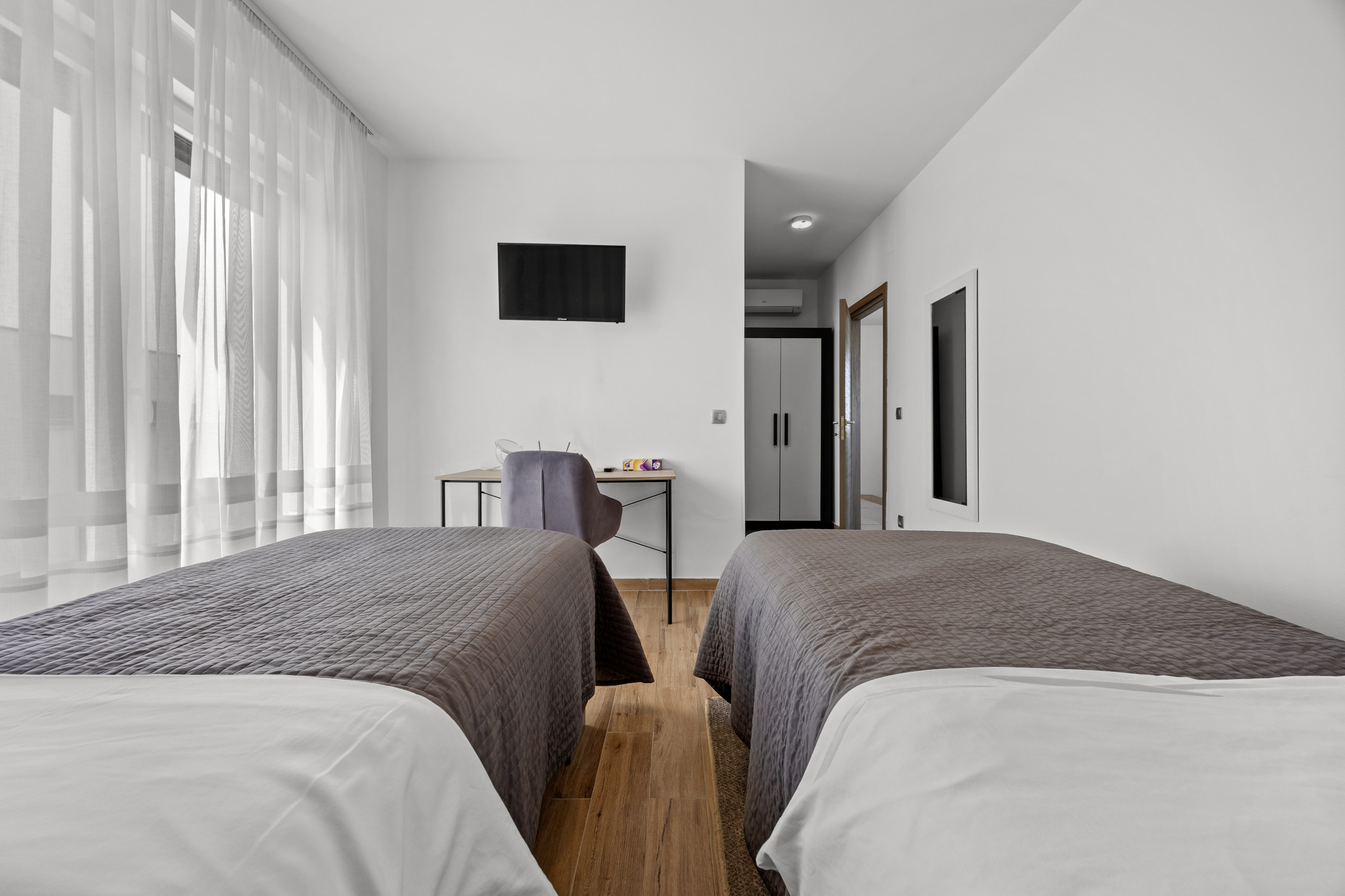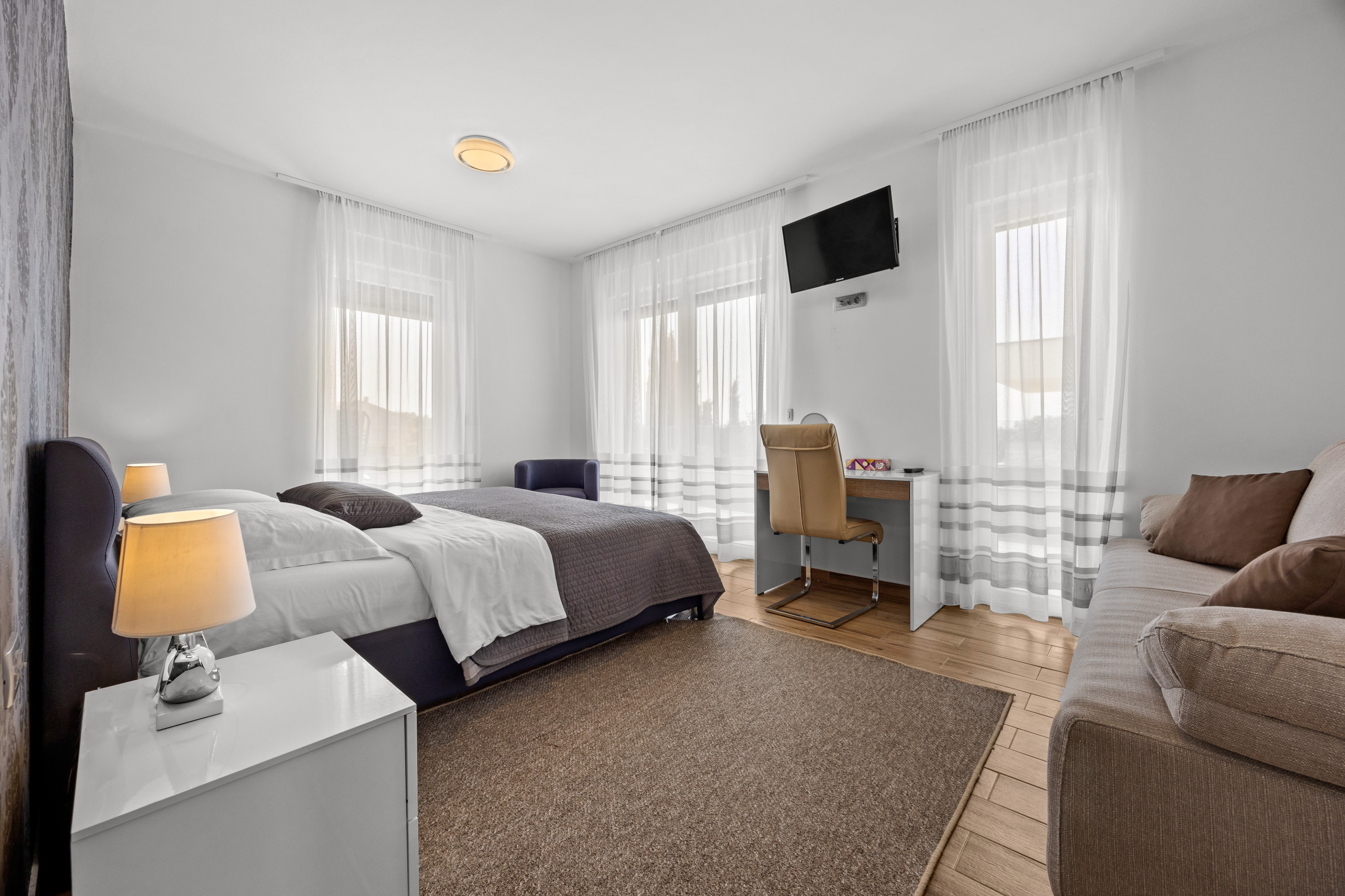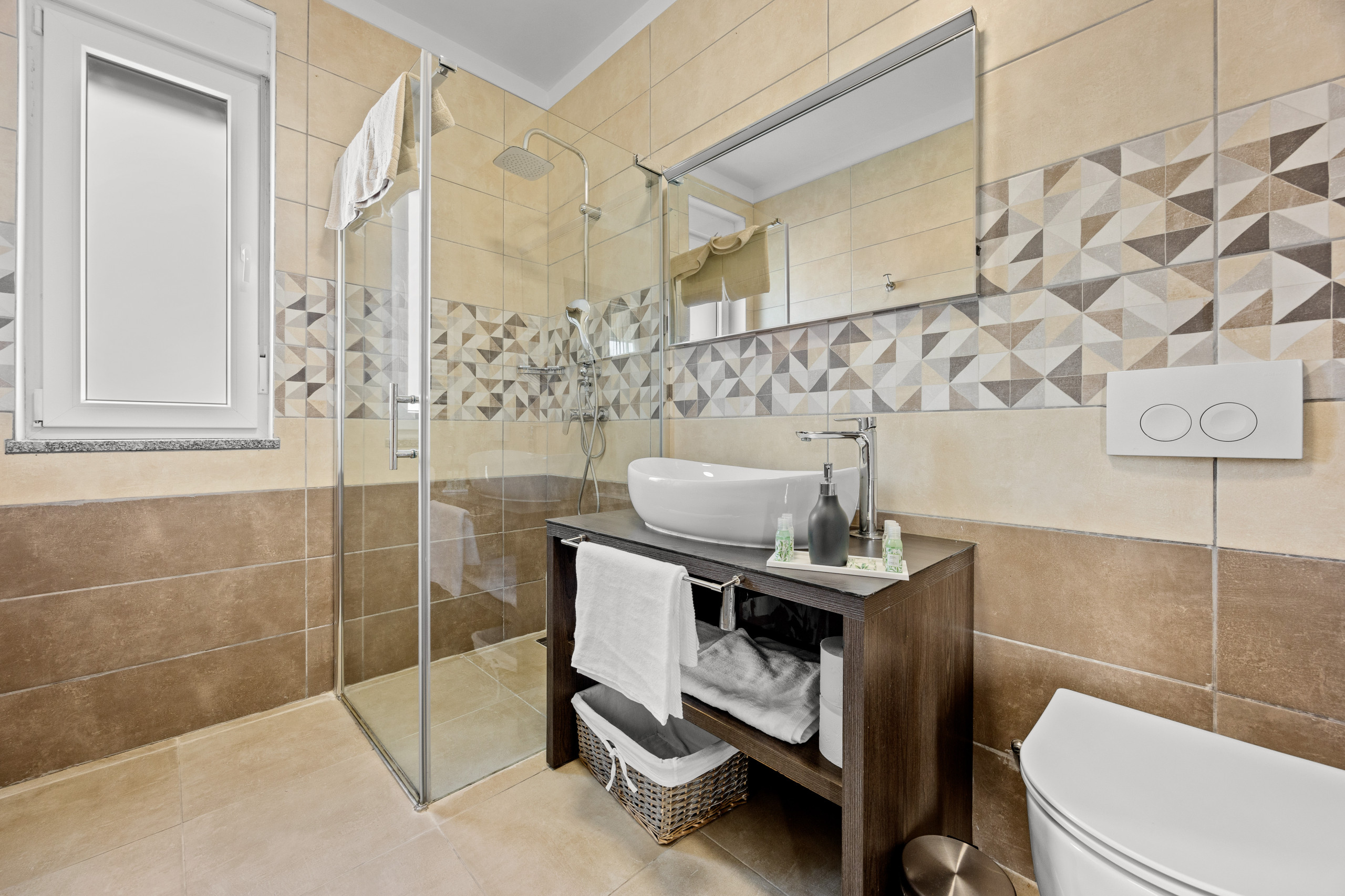 Villa Casa L can host up to 10 people, making it ideal for family vacations or groups of friends. It offers 4 bedrooms—two with double beds and two with double single beds. There is also a comfortable double sofa bed, allowing for 2 extra guests (the extra 2 guests are available for additional costs of 30 EUR per night / per person). The villa has 4 bathrooms, so everyone has space.