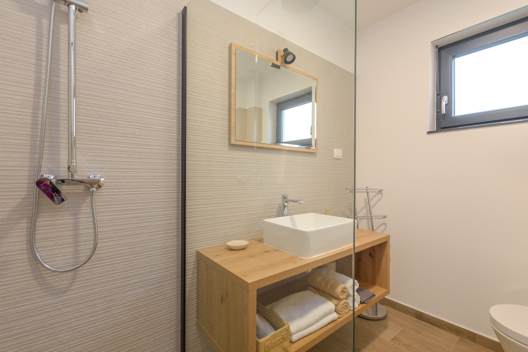 The villa offers 471 m² of interior space on a 3,700 m² private plot and comfortably accommodates up to 8 guests. It features 4 spacious bedrooms and 4 modern bathrooms with walk-in showers, one bathroom also includes a bathtub. In addition, there are 3 extra guest WCs throughout the villa. The villa is equipped with underfloor heating, ensuring comfort year-round.