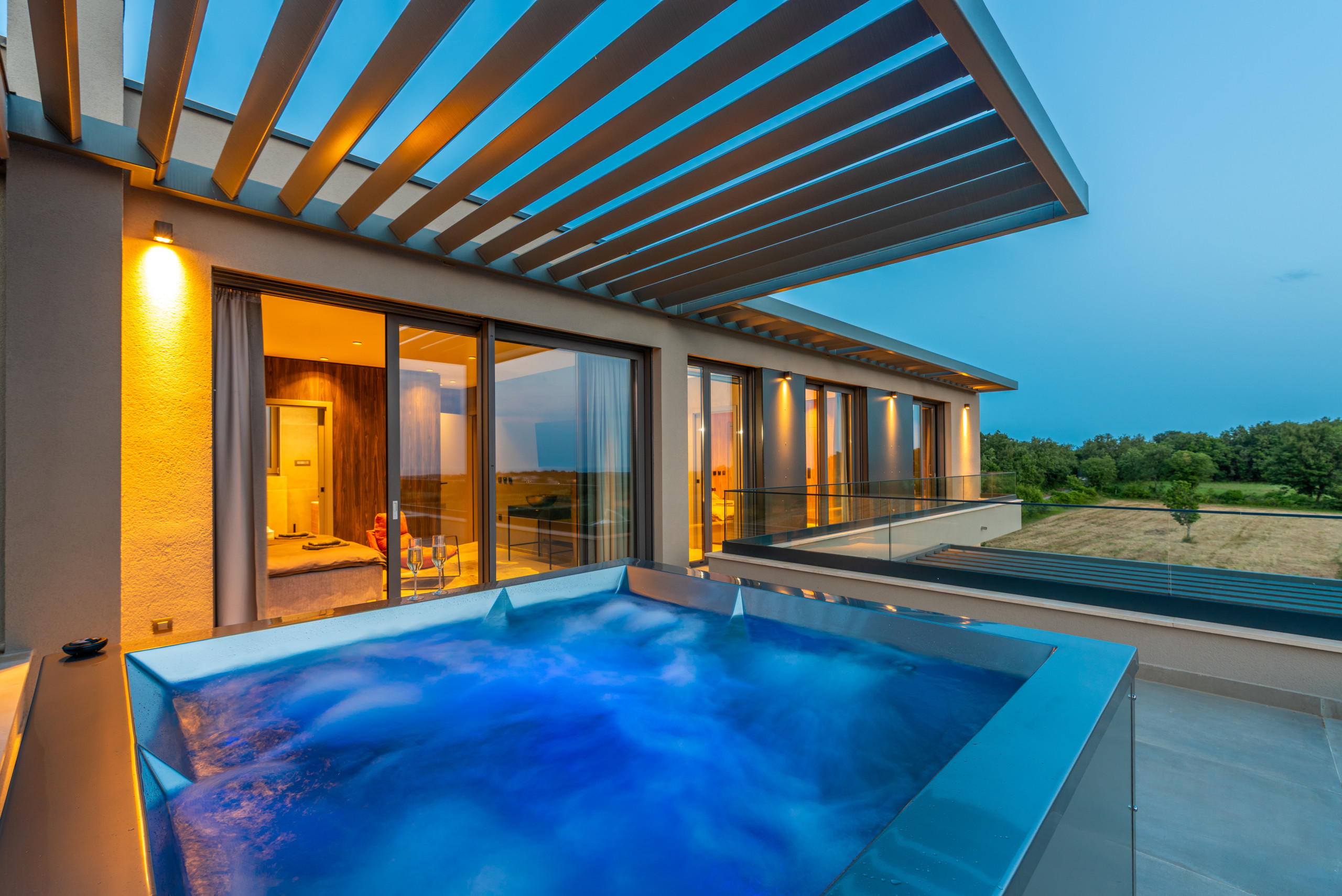 The exclusive Villa Visignano in Visnjan, just a short drive from the charming coastal town of Poreč, offers luxurious comfort across 230 m² of living space on a generous 1,144 m² property. The villa is perfect for 8 guests and features 4 elegantly furnished bedrooms, each with its own en-suite bathroom with a shower. A special highlight is the upstairs bedroom, which boasts a private balcony with a jacuzzi and stunning sea views—an ideal spot for ultimate relaxation.