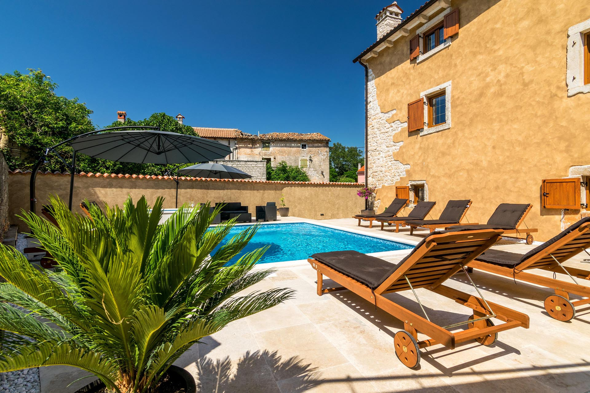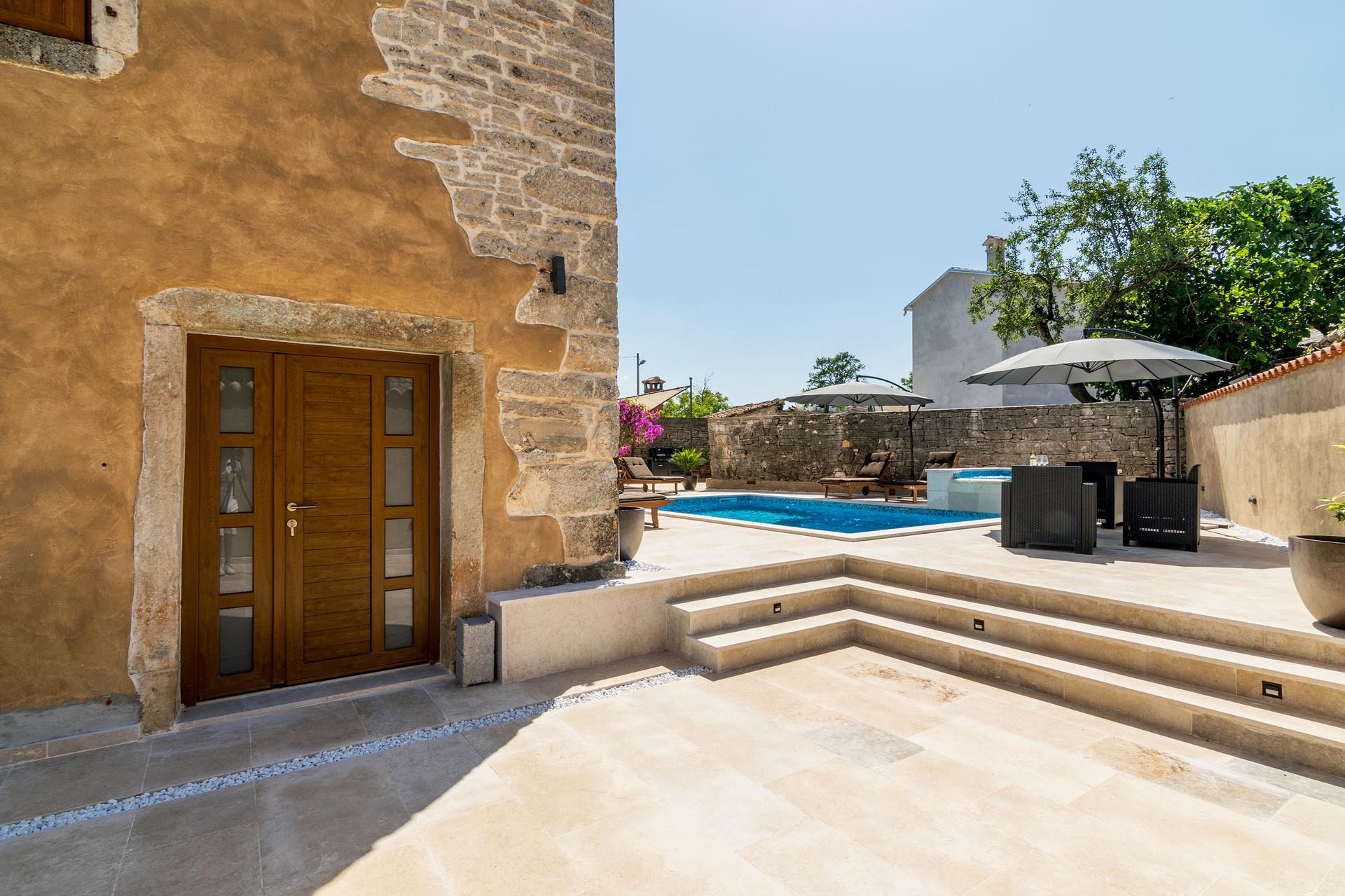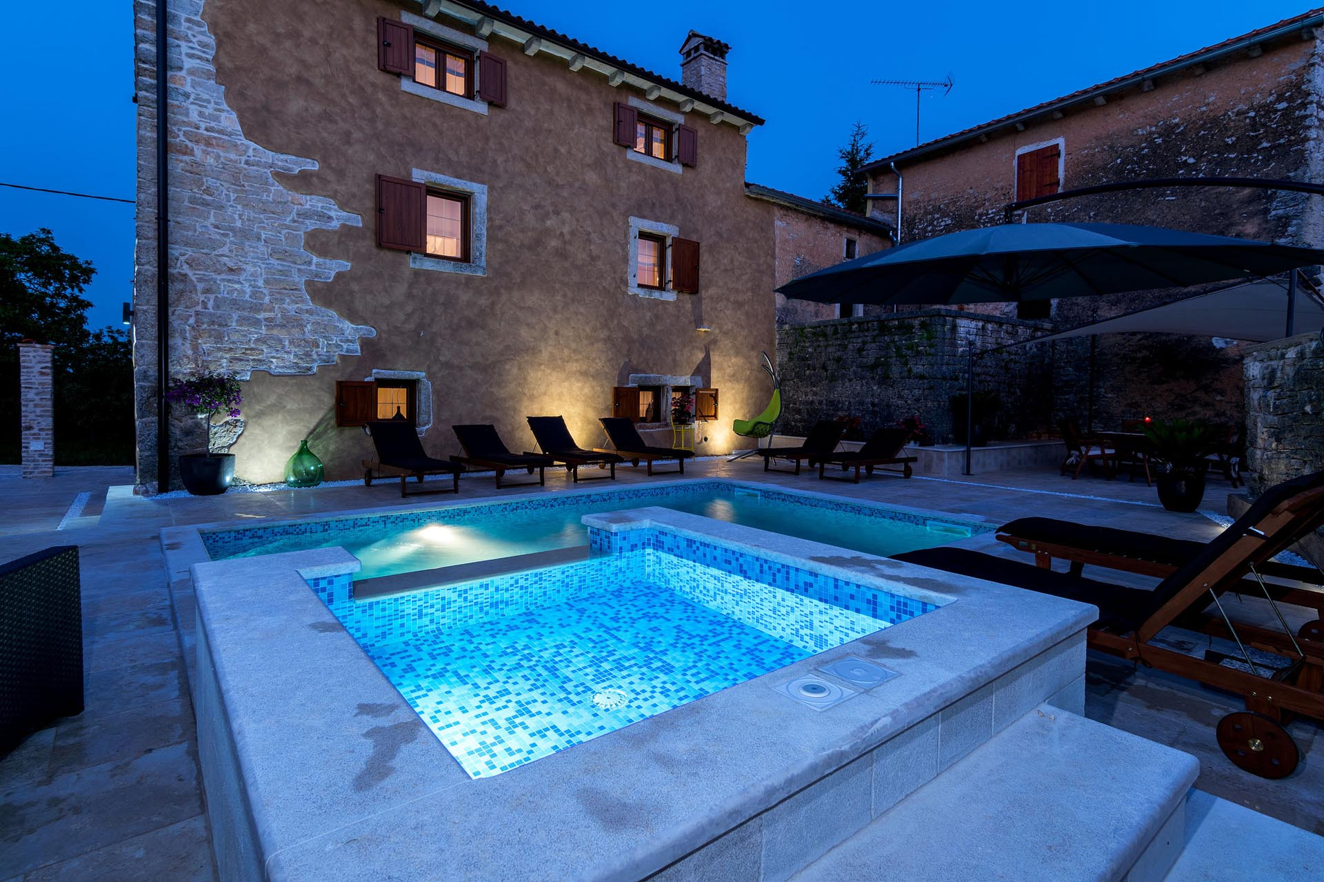 Outside, guests can relax by the 24 m² heated swimming pool (pool heating optional and available at an additional cost) or unwind in the jacuzzi. Seven sun loungers and two sun umbrellas are provided for relaxing days under the Istrian sun. A gas grill and outdoor dining table create a wonderful setting for shared meals in the fresh air.
