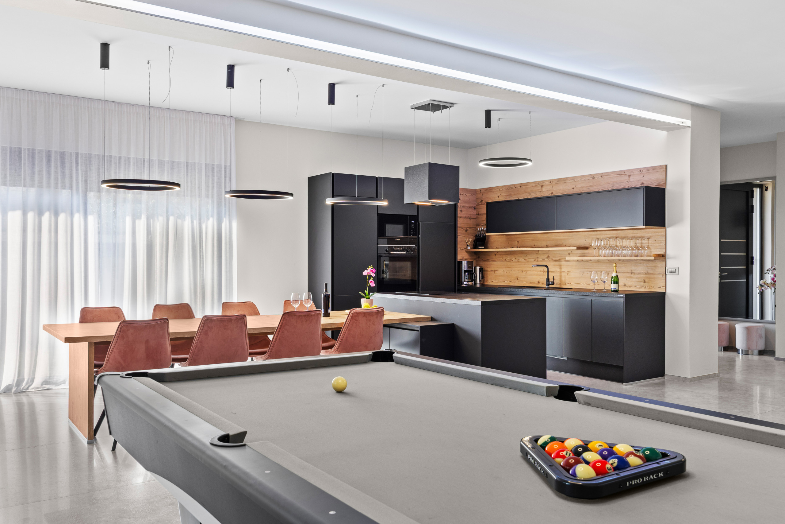 Размещение имеет зеленая зона, сад, oгороженный участок, стиральная машина, Барбекю, утюг, Доступ в интернет (wi-fi), Фен, Балкон, Сигнализация, Сауна, кондиционер, закрытый бассейн собственный бассейн, Открытая парковка в этом же здании, москитные сетки во всём помещении, 5 телевизоры, спутниковая антенна (языки: англиийский, немецкий, французский).